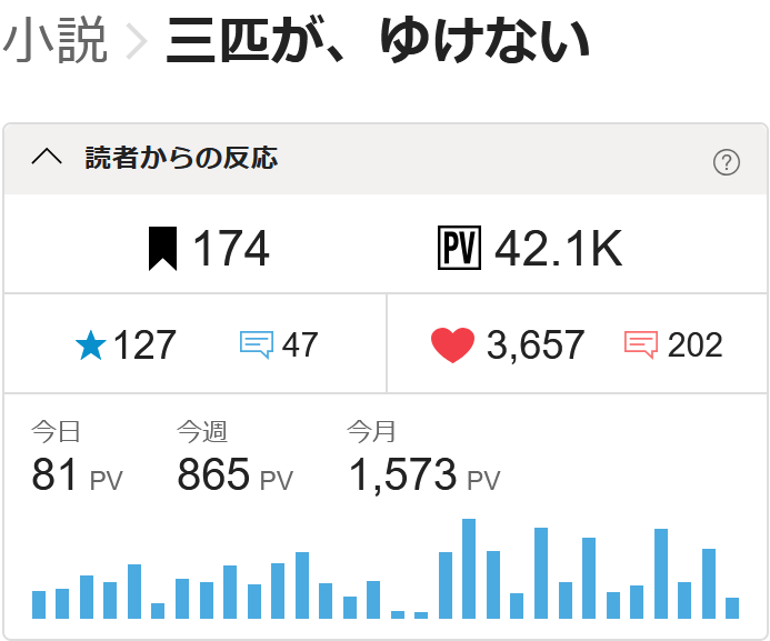昨夜遅く、拙著『三匹が、ゆけない』の累計PV数が42000PVに到達いたしました。誠にありがとうございます。