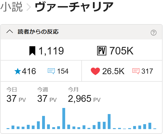 昨夜遅く、拙著『ヴァーチャリア』の累計PV数が705000PVに到達いたしました。誠にありがとうございます。