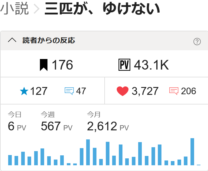 昨夜遅く、拙著『三匹が、ゆけない』の累計PV数が43000PVに到達いたしました。誠にありがとうございます。
