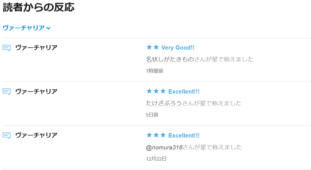 本日、拙著『ヴァーチャリア』に 名状しがたきもの 様より★を頂戴いたしました。誠にありがとうございます。