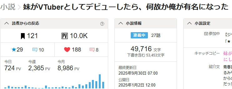 『妹がVTuberとデビューしたら、何故か俺が有名になった』が、念願の10000PVを達成致しました。(画像はお昼時点のものです)