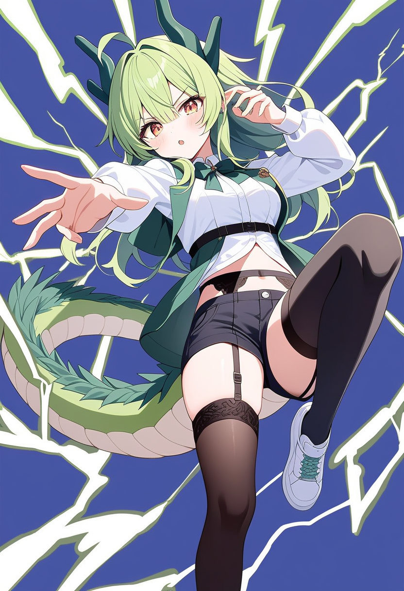 いつも通りなんですがAI君にイメージ画像を作ってもらいました。今回は元クソデカ雷龍ですね。服装は現代に近いような世界なんでねこういうのもありますよ。お納めください。