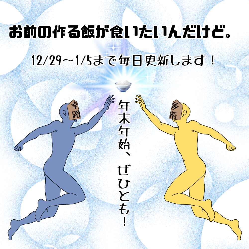 https://kakuyomu.jp/works/16818622175559663137がですね、1/5まで毎日更新になりますよ、っていう。ただそれだけのお知らせでございます。ガチの毎日更新なので、土日関係なく更新しますし、元旦も更新します!( σ´∀`)σ