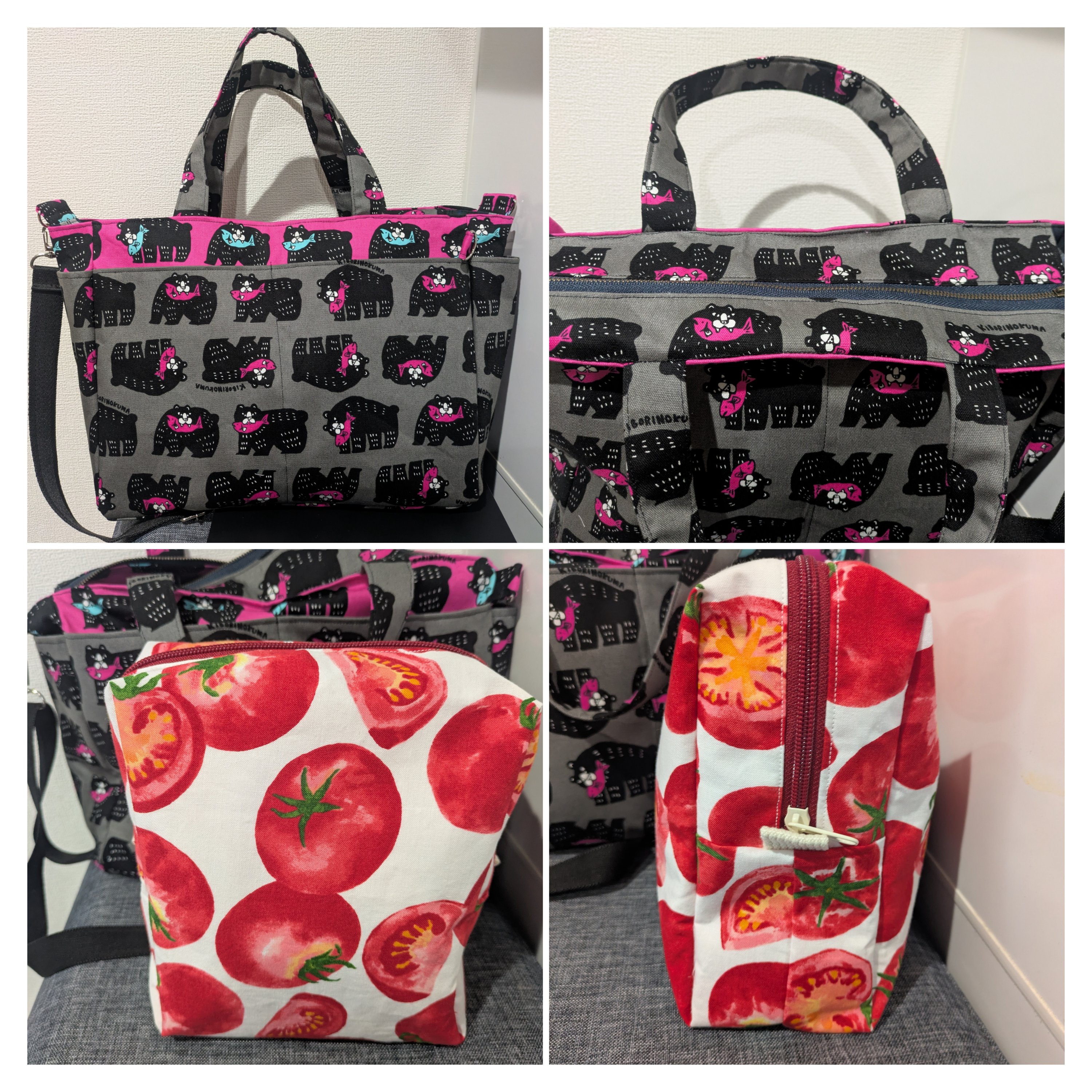 それと、バッグインバッグーーとまではいかないんですけど、こまごましたものをまとめる用のでっかいポーチ。トマト柄は柄布まとめ売りの中に入ってたやつですね。なかなか使う機会がなかったんですけど、ポーチなら!と。