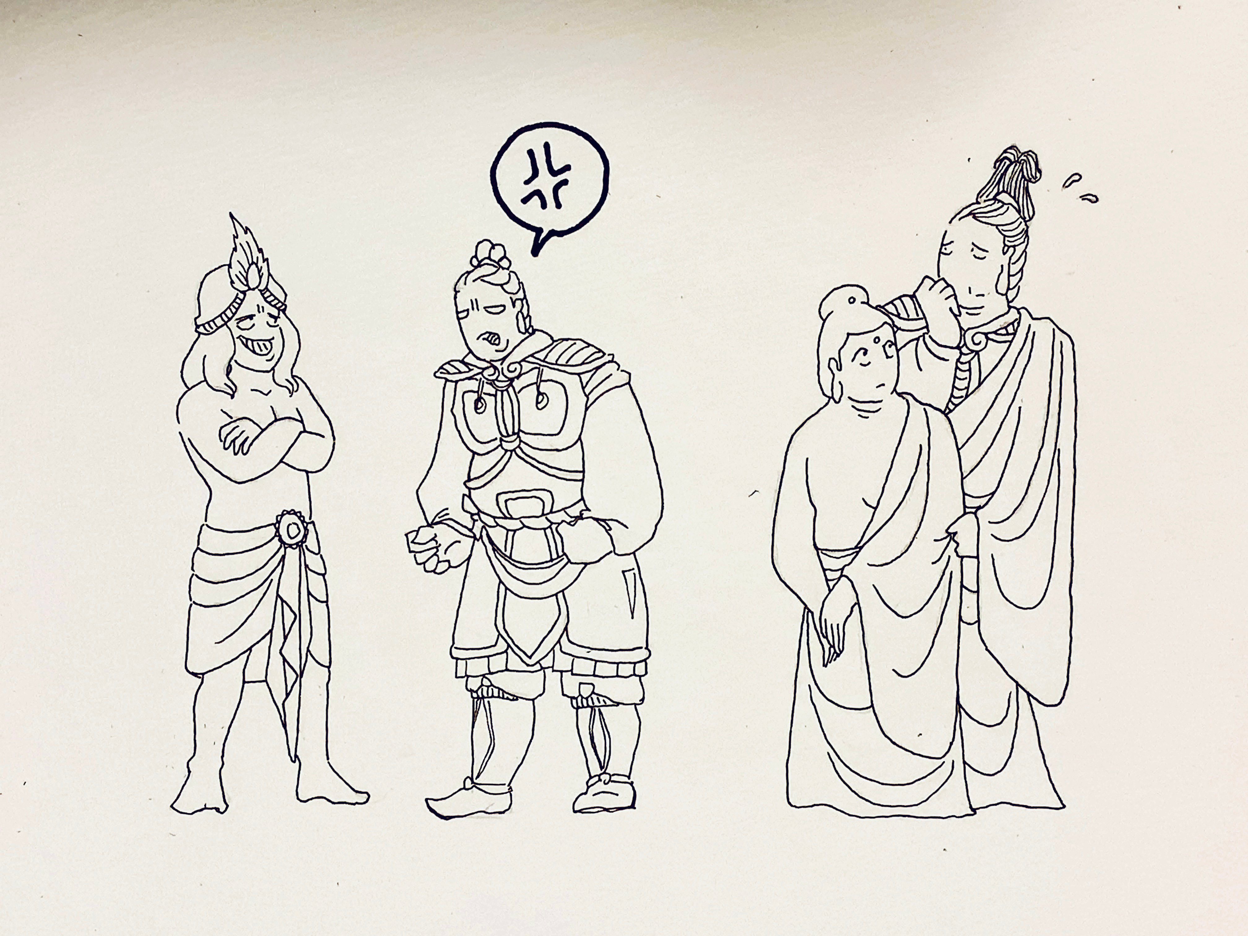 右端の焦って仏を盾にしているのが帝釈天、隣りがお釈迦さま、「💢」なのが毘沙門天、にやついているのがいたずらヴィシュヌです。