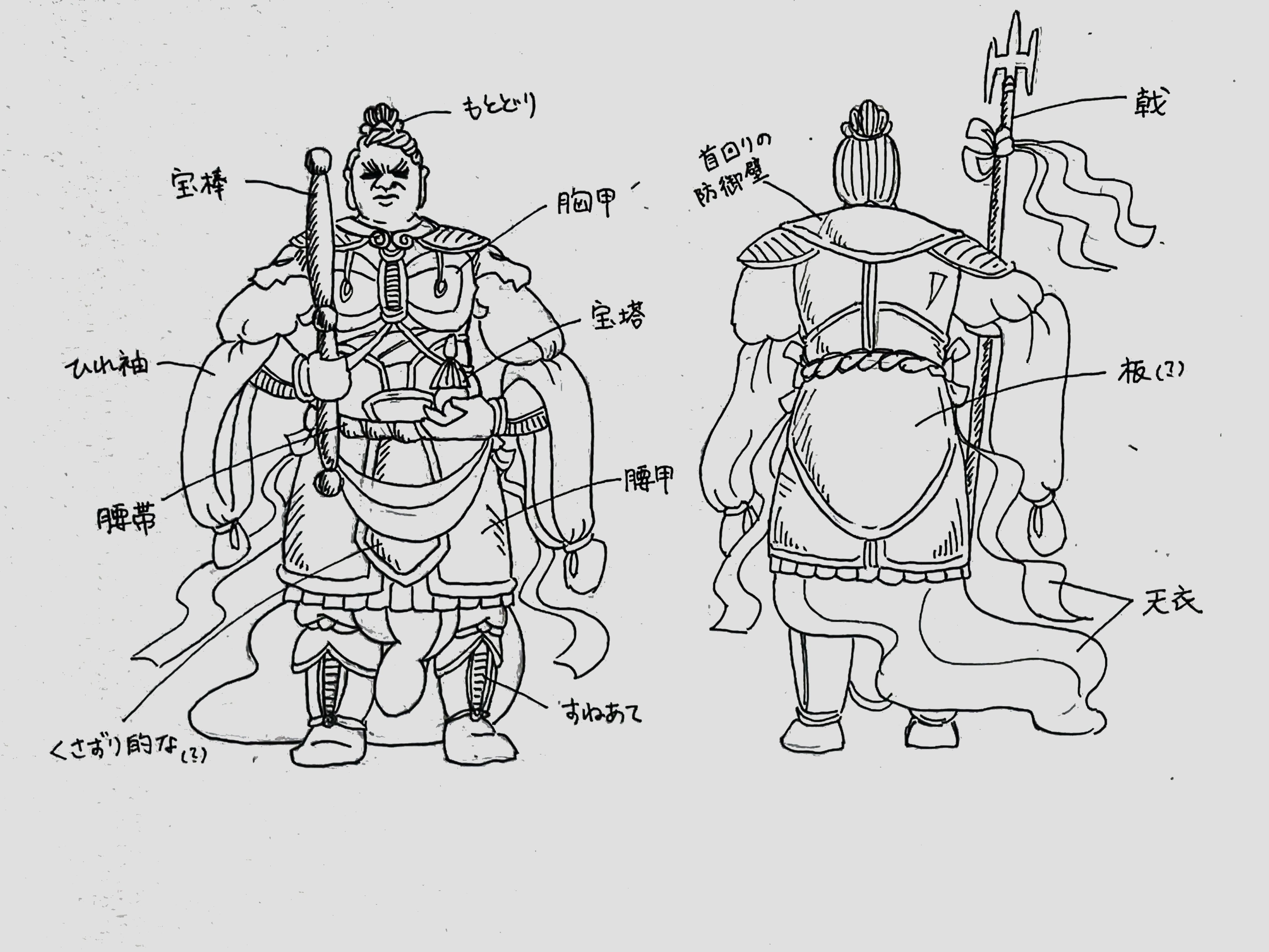で、ですね。私、中華風甲冑の構造、あまりよくわかっていないのですよ。Googleで調べても、中華風の鎧はなかなか詳しく出てきてくれません。イラストも、図録を見様見真似で描いてまして。