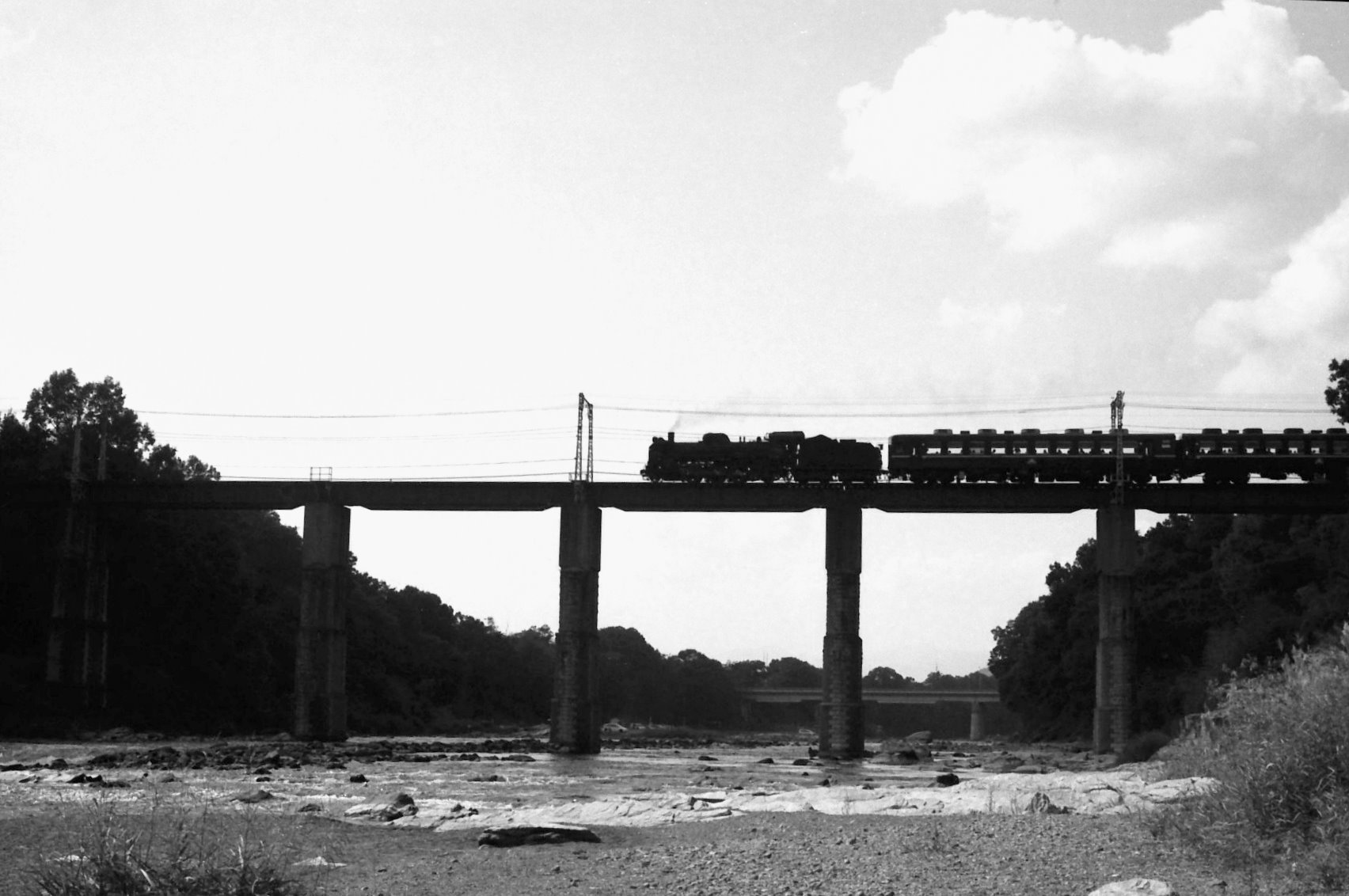 写真は第二章で登場した秩父鉄道のSL急行「パレオエクスプレス」が、作品の舞台となった上長瀞駅~親鼻駅間の荒川を渡る鉄橋を走行するシーン。撮り鉄を始めたばかりの頃、亡き祖父の形見の一眼レフカメラで撮影した白黒フィルム写真です。