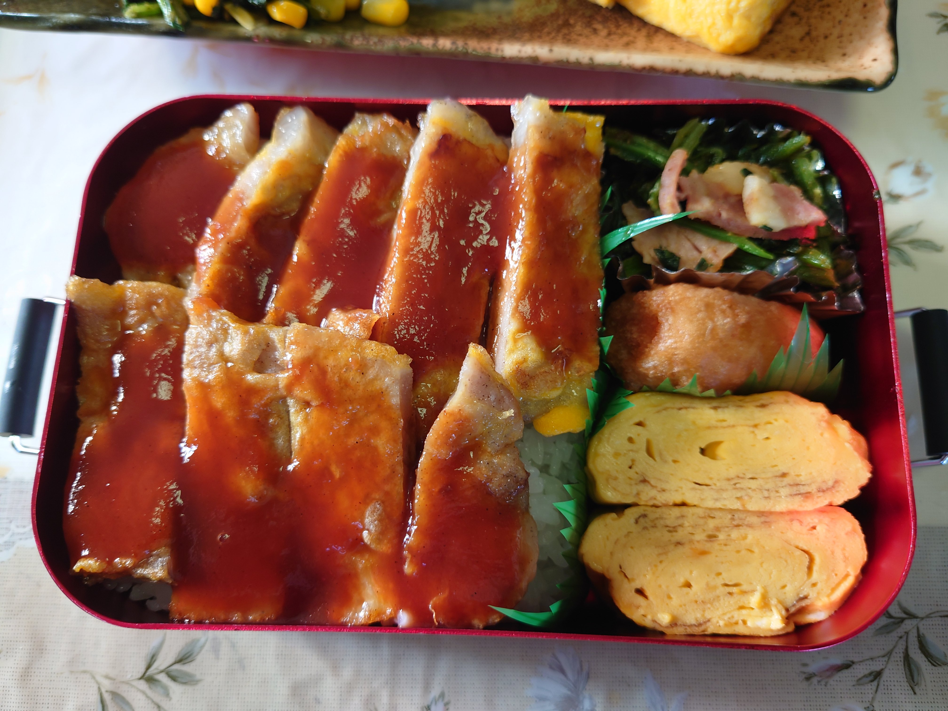 したのを、出汁とケチャップ、塩コショウ、オイスターソースを混ぜたソースをかけた丼弁当!