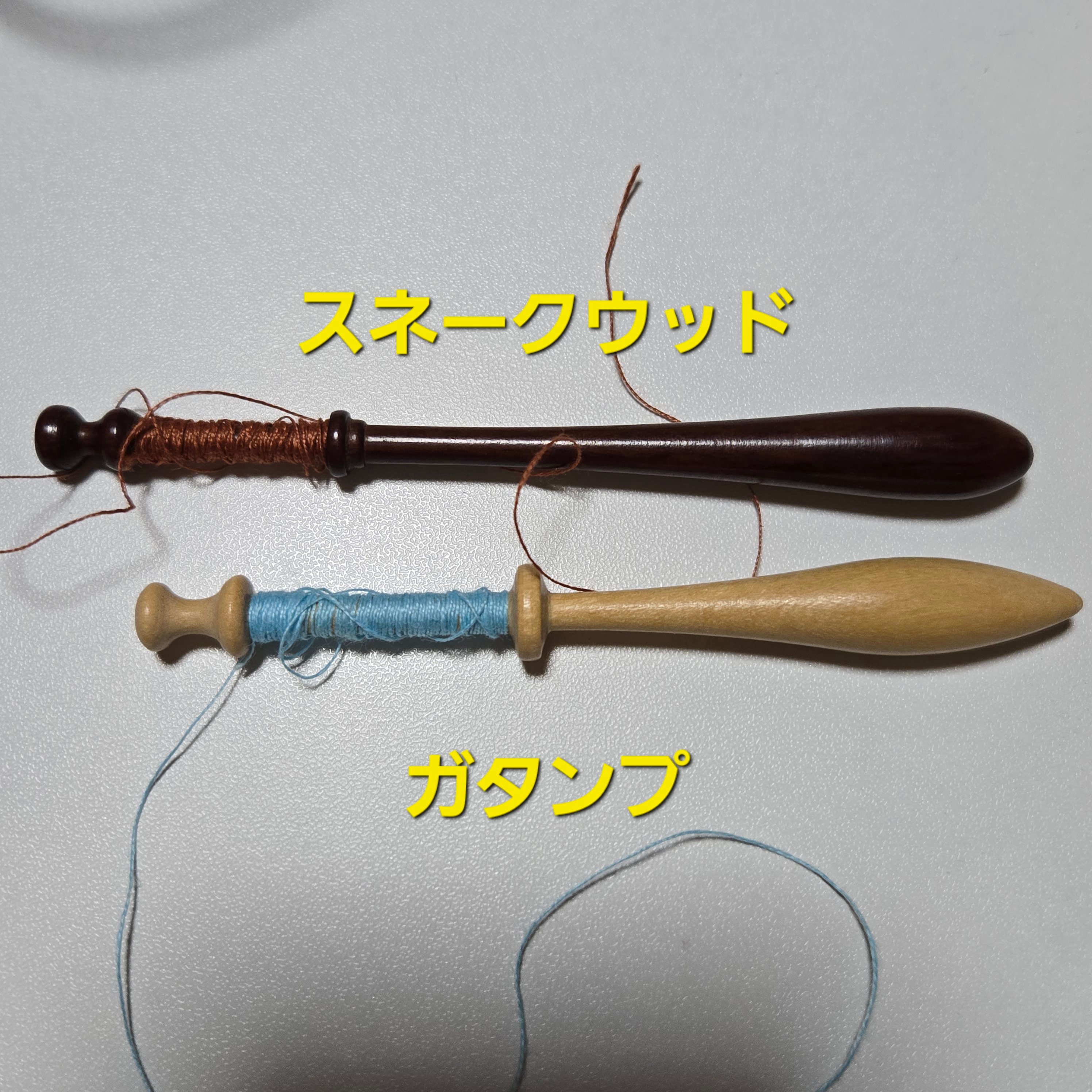 黒檀は持っていないので、隣に、私の持っている密度の高い木材のスネークウッドのボビンも置いています。