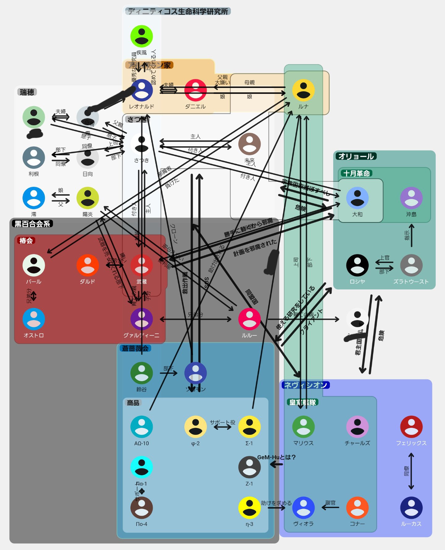 キャラクターの相関図を作りましたが、群像劇スタイルで登場人物が多い都合上、蜘蛛の巣が張ったように矢印が網状になってしまいました。