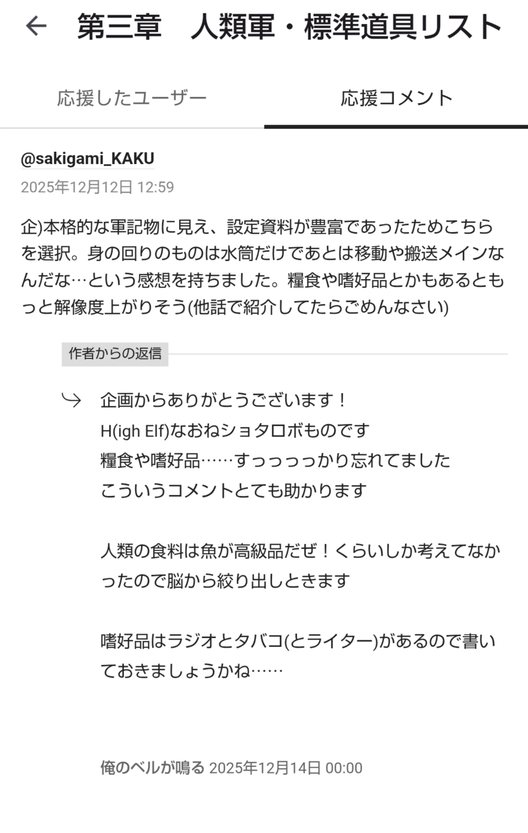 企)本格的な軍記物に見え、設定資料が豊富であったためこちらを選択。身の回りのものは水筒だけであとは移動や搬送メインなんだな…という感想を持ちました。糧食や嗜好品とかもあるともっと解像度上がりそう(他話で紹介してたらごめんなさい)