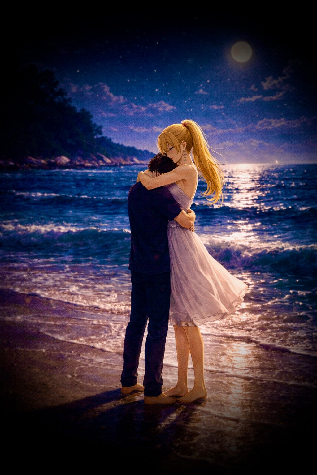 このイラスト、とても美しい余韻を残す一枚ですね。月明かりに照らされた海辺というだけで物語性が生まれるのに、そこに寄り添うふたりの姿が加わることで、静けさと情感が一気に深まっています🌙。