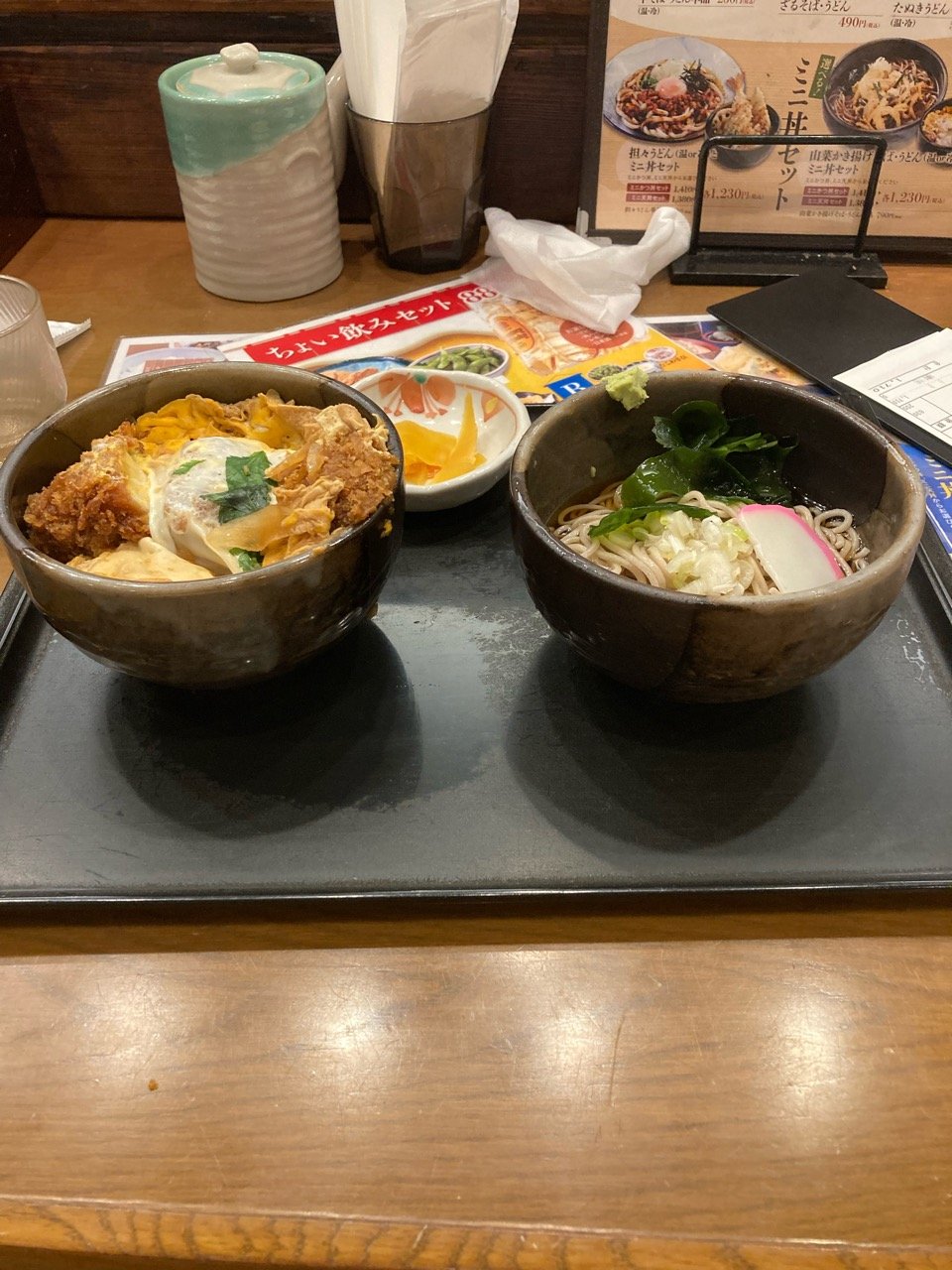 画像はミニカツ丼ミニ蕎麦セット……もうおいらも歳だよ……ほんの数年前なら富士山盛カツ丼セットだったのに……!