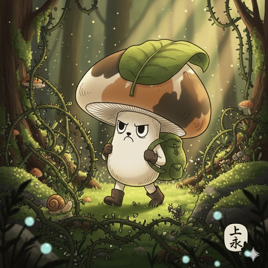 自分にあった、最高のタンパク質を求め、住み慣れたキノコのコロニーを旅立ちました。森を抜け、イバラの道を細い腕でかき分け、カサに傷を作りながら進みます。