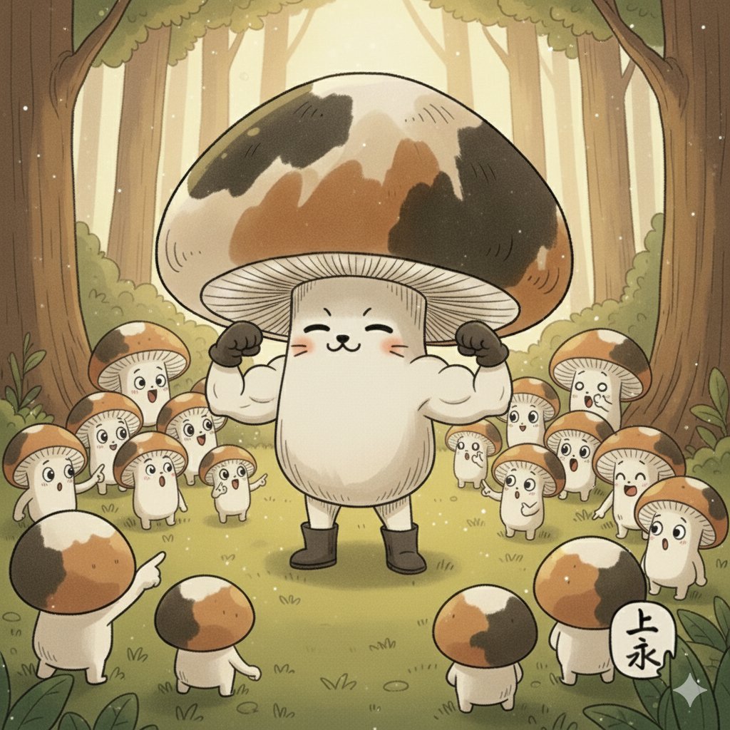 その結果。ある朝、しめじが目覚めると、世界が変わっていました。細かったはずの腕は、丸太のように太く、硬くなっています。ついにマッスルキノコの誕生です。