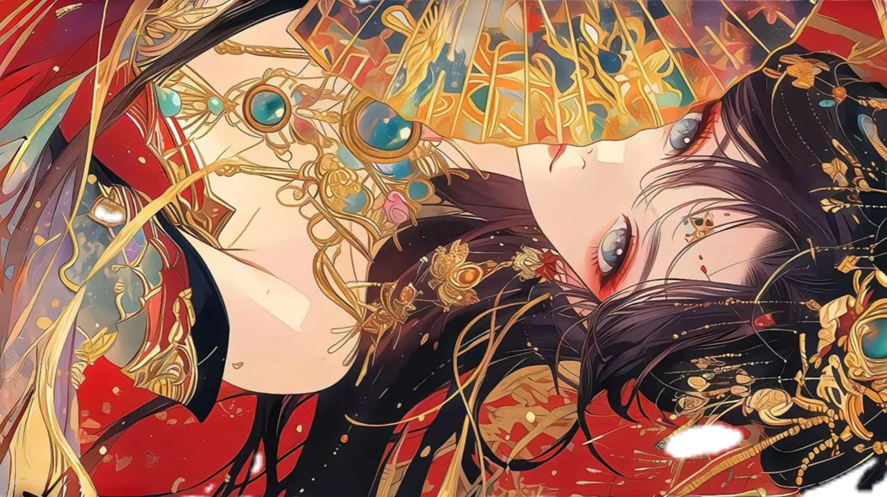 袍の下からは黒の襦裙が覗き、腰には翡翠の帯締めと玉佩が下げられ、歩揺の金の飾りが髪の動きに合わせて軽やかに揺れている。髪は高く結い上げられ、鳳凰の簪と珠玉の飾りが散りばめられ、頰には薄い紅を差し、唇は朱を塗って艶やかだった。普段の男装の凛とした武人姿とは打って変わり、女の本性を露わにしたその容姿は、息を呑むほどの美しさと妖艶さを放っていた。