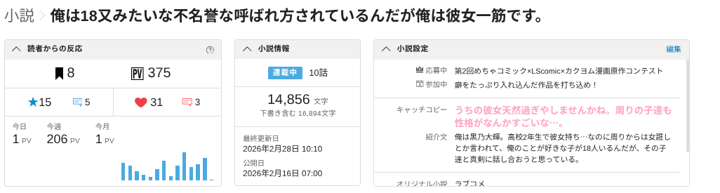 俺は18又みたいな不名誉な呼ばれ方されているんだが俺は彼女一筋です。は皆様のおかげでこの作品は2月中に『300PV突破』・『☆15個』・『♡31個』を獲得することに成功島した。誠にありがとうございます。心から感謝を申し上げます。今月、今年、これからもどうぞ俺は18又みたいな不名誉な呼ばれ方されているんだが俺は彼女一筋ですをよろしくお願いします。