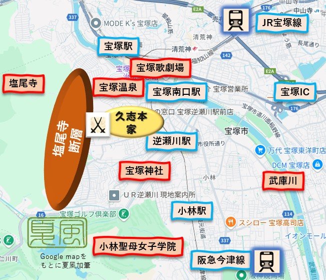 「92話塩尾寺断層の闘い」のマップです。剣奈関連の宝塚市の概略と塩尾寺断層の位置です。おおよそで実際と多少ずれがあるかもです。小林聖母女子学院(小説創作)は千鶴と千剣破の母校です。