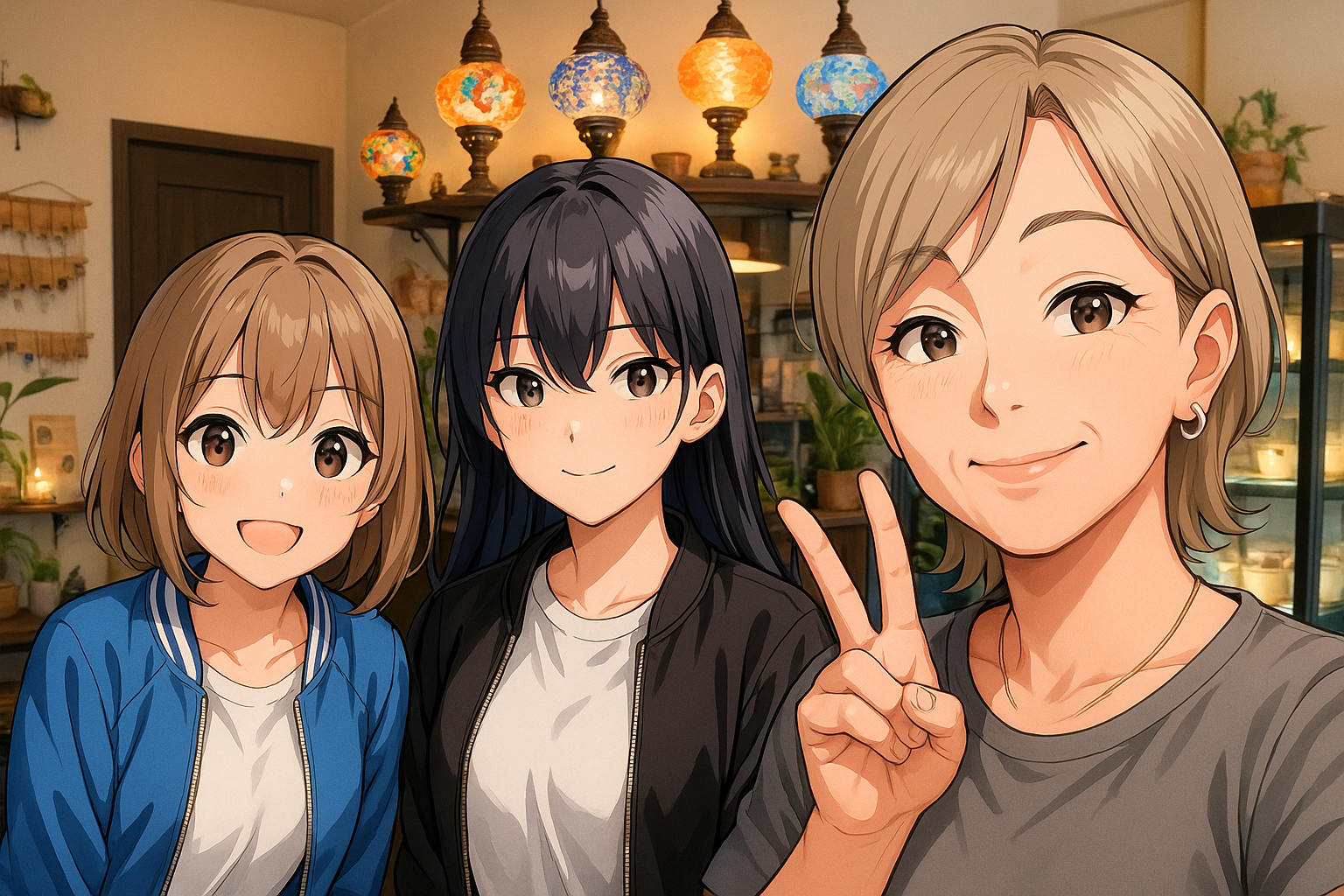 ※今回はkimiさん撮影のセルフィーを基にしたChatGPT作成のAIイラストを貼らせて頂きます。しまなみブルー本編で結と凛がK-worksに来てkimiさんにセルフィー撮って貰った感じのイメージです。(*´∇`*)