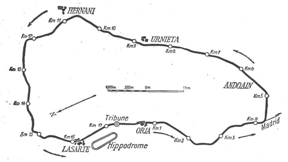 追記:この図は1935年のコース図で、10kmポスト手前のS字が1934年に比べて大幅に緩くなっています。