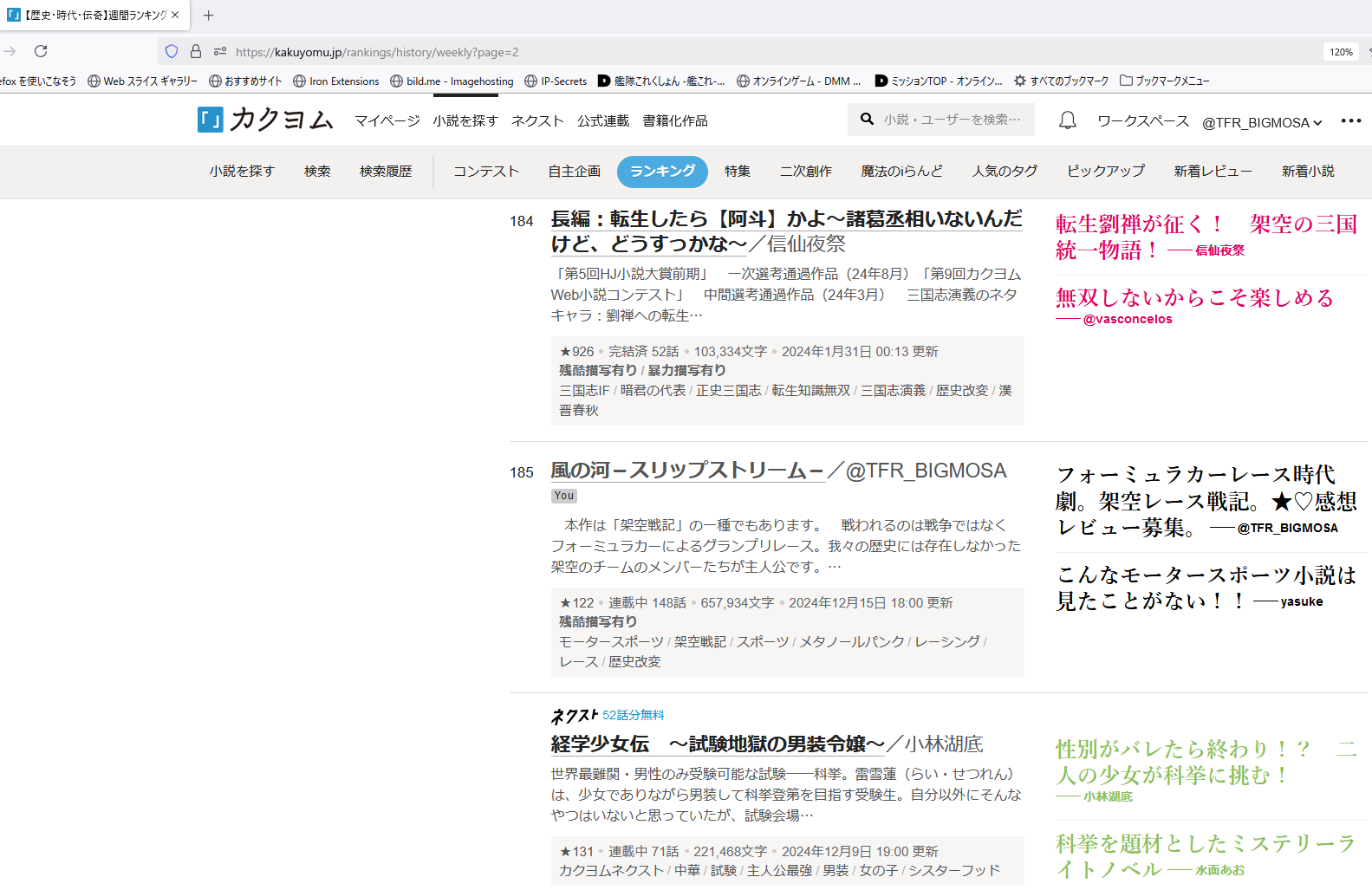 私も歴史・時代・伝奇で久々に週間ランキング入りしました。