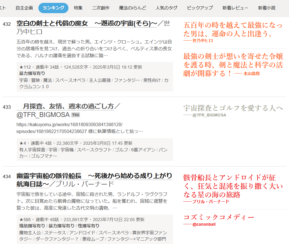 本当にカクヨムSF週間ランクインしてました。