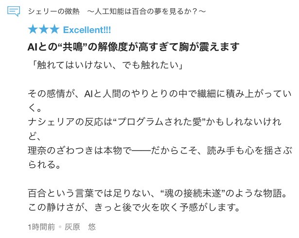 拙作「シェリーの微熱 〜人工知能は百合の夢を見るか?〜」にレビュー(⭐︎)を頂きました!