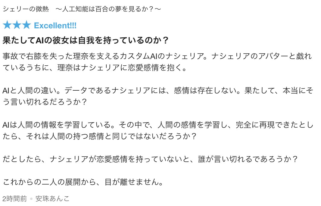 拙作「シェリーの微熱 〜人工知能は百合の夢を見るか?〜」にレビュー(⭐︎)を頂きました!