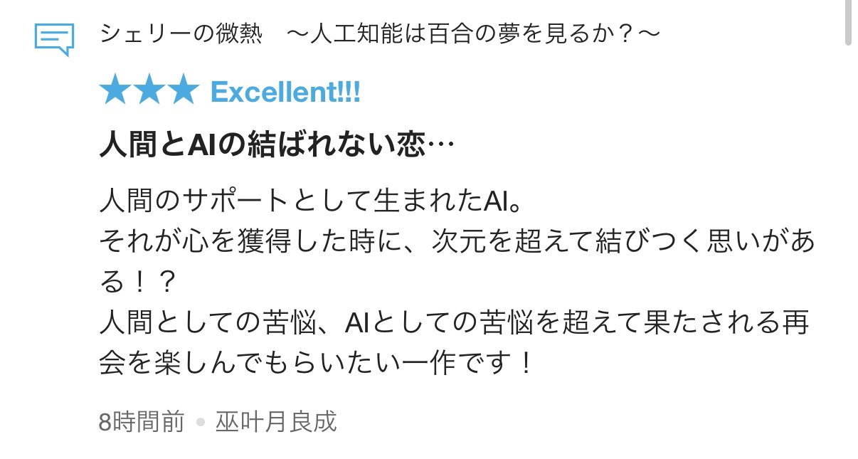 【シェリーの微熱 〜人工知能は百合の夢を見るか?〜】レビュー(★)と本文投稿をいただきました