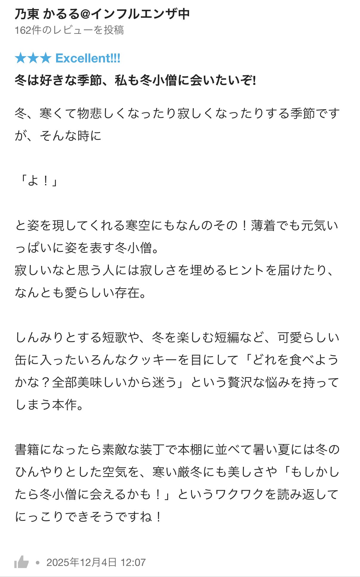 「冬小僧」にレビューコメントを頂きました!