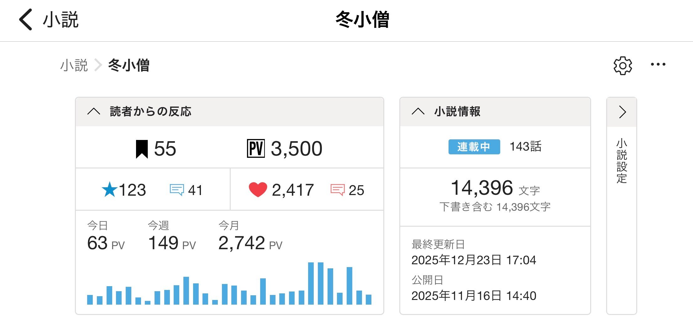 拙作「冬小僧」のPVが3500に到達いたしました!!