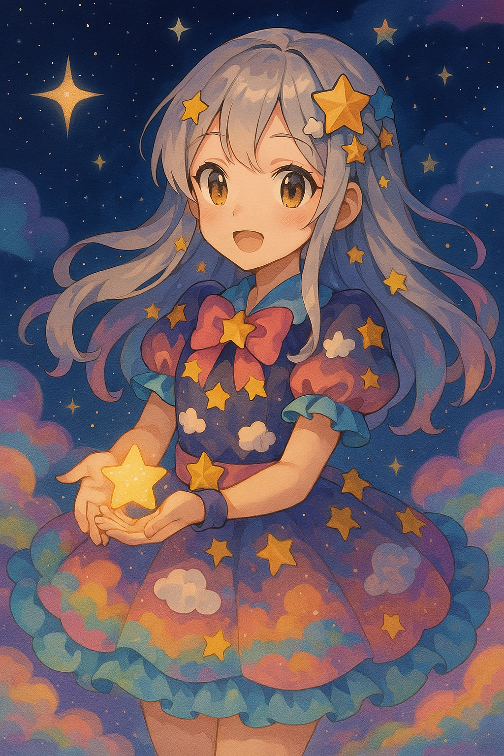 困ったな、と思ったナナは、その小さな星を手のひらに乗せて、そっと空に掲げました。すると、虹色の雲が優しく星を包み込み、まるで道しるべのように、キラキラと輝き始めたんです。