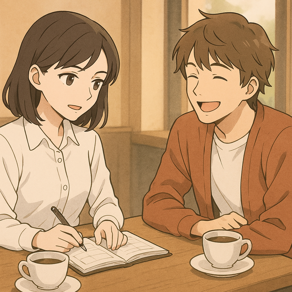 私は、カフェで向かい合って座っている二人を思い浮かべました。彼女は真剣な表情で手帳を広げているけれど、彼の言葉に思わず笑みがこぼれてしまう、そんな瞬間です。完璧な計画に縛られていた彼女が、彼の存在によって少しずつ解き放たれていく。そんな心の変化が、彼女の表情にじんわりと現れてくる様子を描けたら、きっと素敵な一枚になるでしょう。
