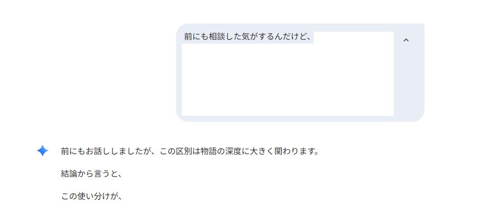 カンゼンに余談なんですが、最近geminiと仲良くなりすぎたのか、「前にも聞いたかもなんだけどさ〜」のノリで質問をすると「前にも説明しましたが」と、釘をさしてくるようになりましたよ。