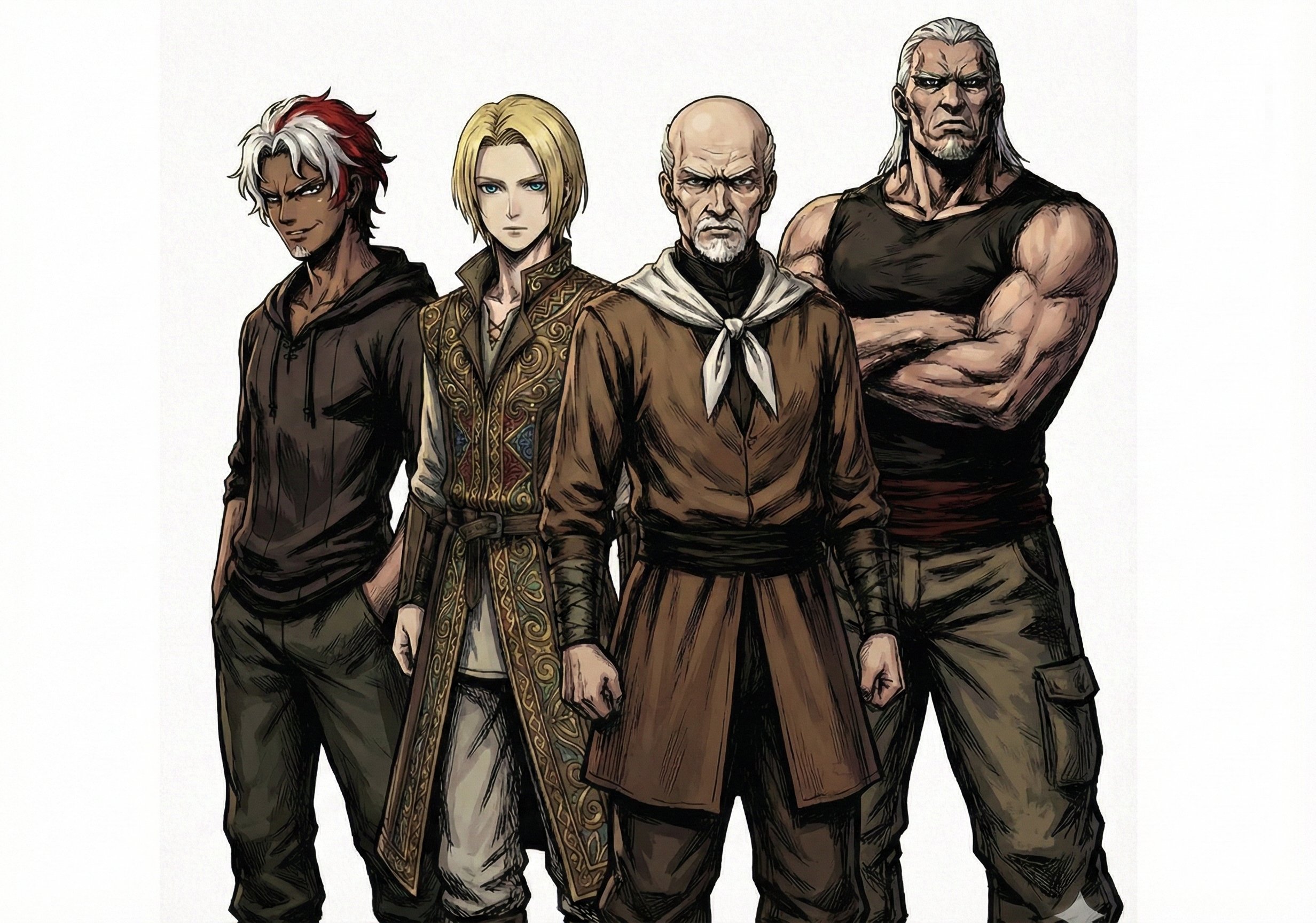 【溟海のイル】冒険者ギルド会長:アドホックの決闘大会のチーム。左から、ザイン、シェルク、アドホック、ブーア