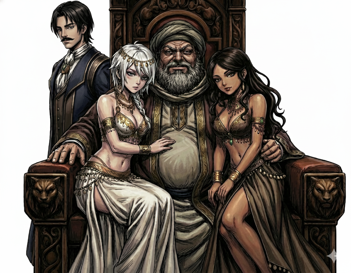 【溟海のイル】のザーラム共和国執政官バージェスと娼婦、背後には財務官ワキール