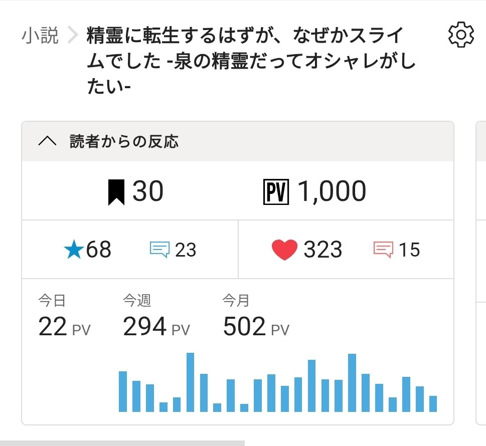 【精霊に転生するはずが、なぜかスライムでした ― 泉の精霊だってオシャレがしたい ―】のPV数が1,000を達成しました!ありがとうございます!