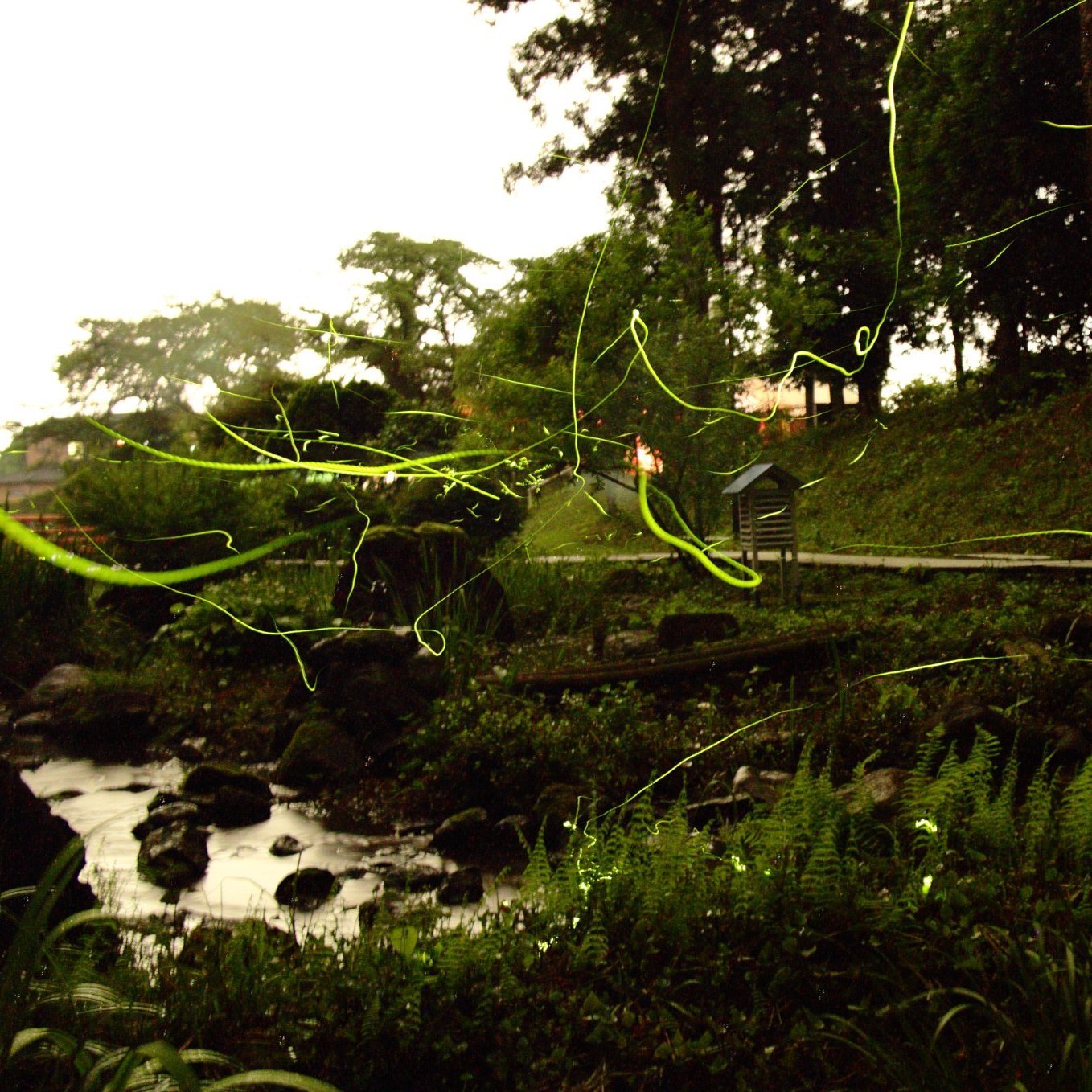 掲載した写真は、夜の池の上を舞うホタルの姿。