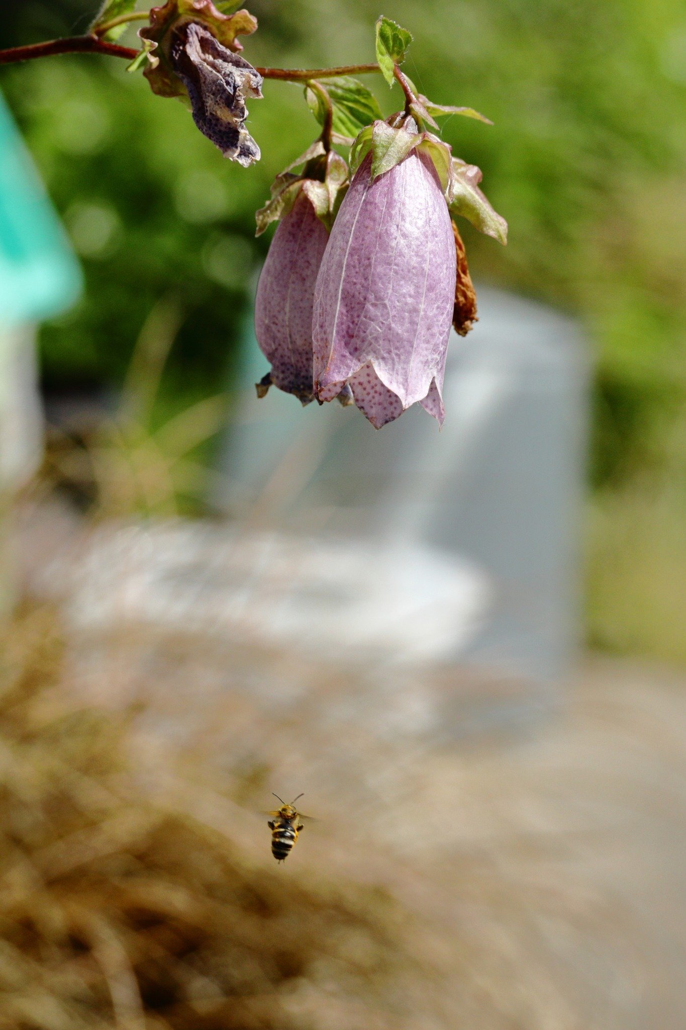 写真は、ホタルブクロに向かって飛ぶスジボソコシブトハナバチの飛翔の瞬間です。