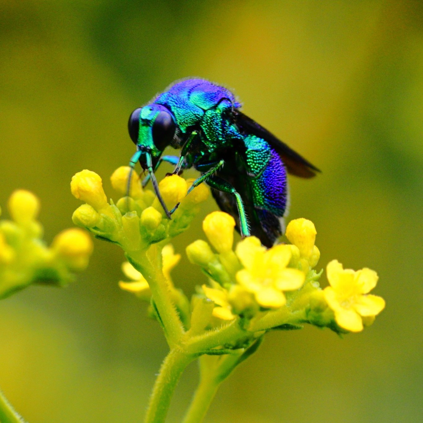 ブルービーの撮影中に現れた、オオセイボウ。これは宝石蜂と呼ばれる、青く輝く蜂です。写真を添付しました。