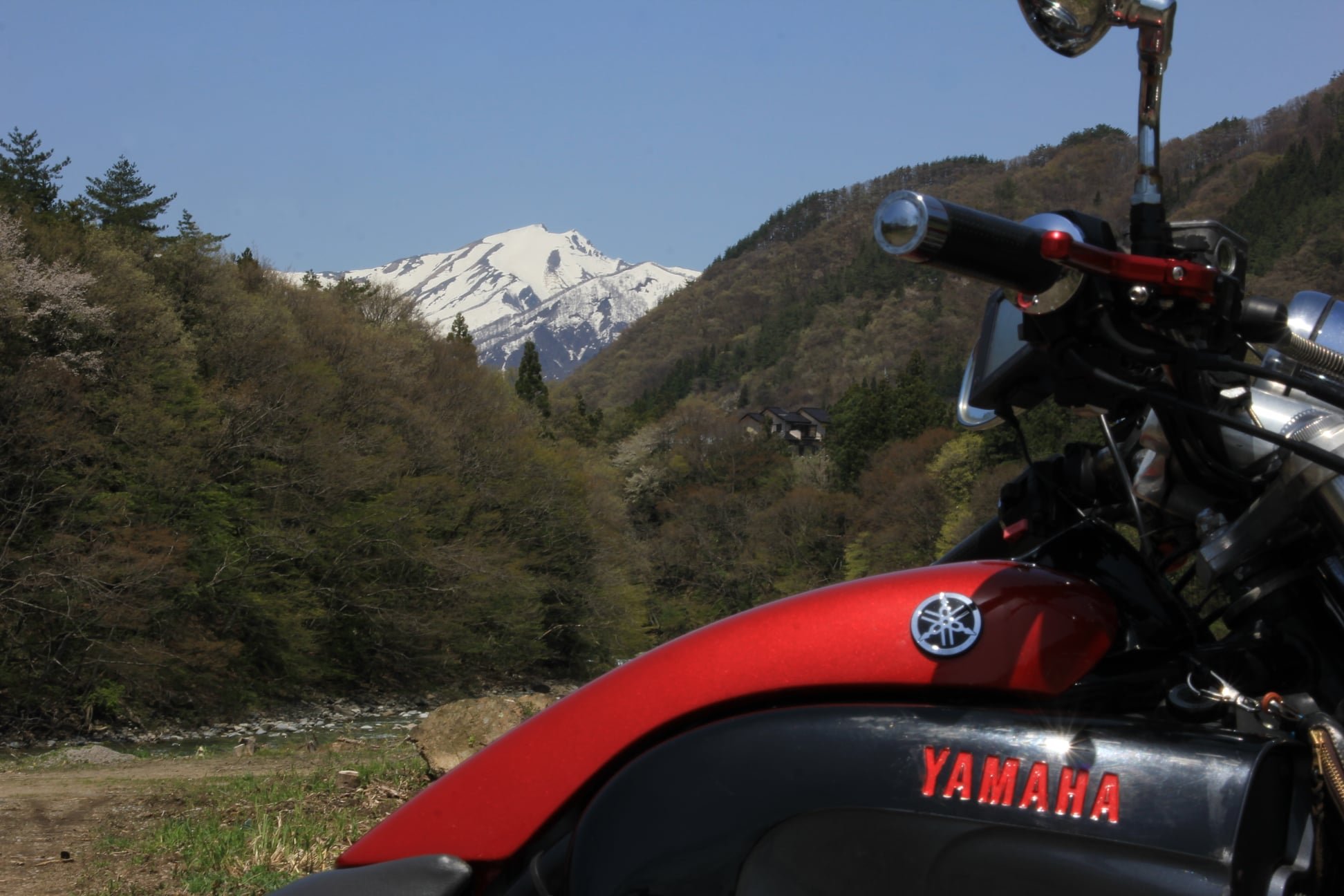 赤いV-maxと青空、そして白い雪をいただいた谷川岳──思い出と共に一枚に収めました。