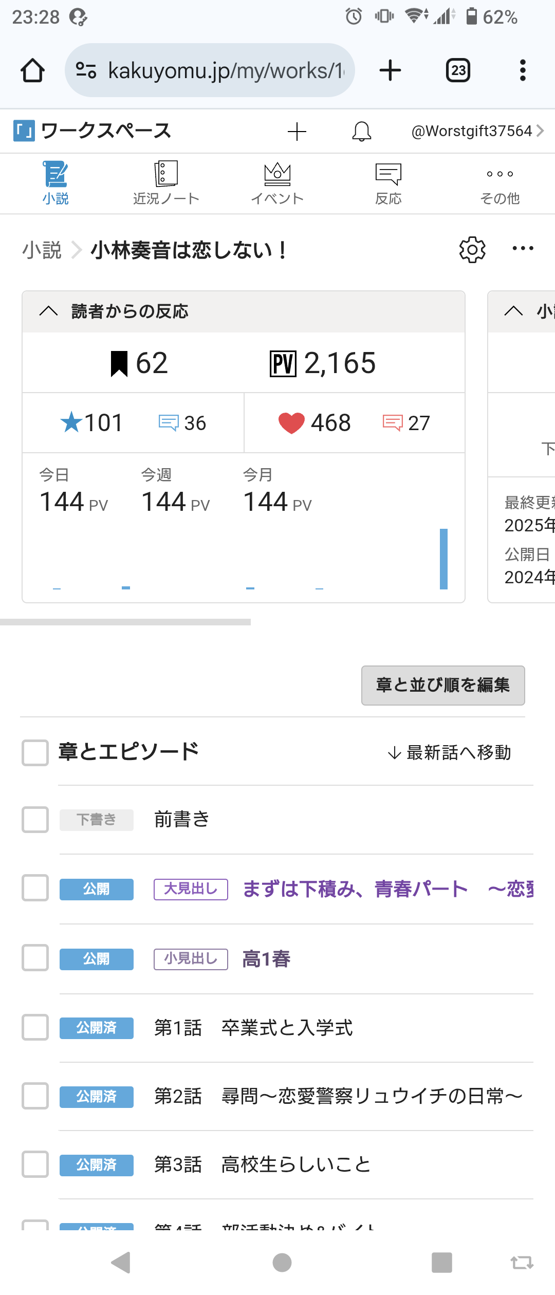 なんか、「小林奏音は恋しない!」が星100を超えたらしいですよ