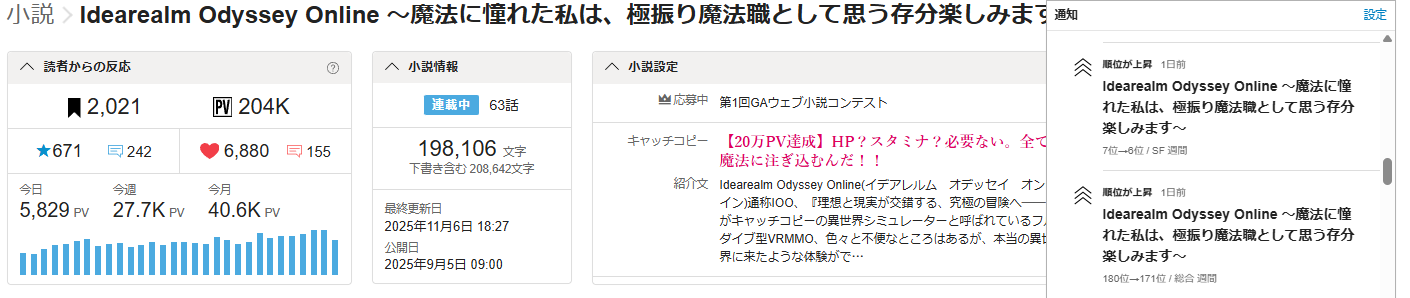 タイトルにも書きましたが作者の小説『Idearealm Odyssey Online 〜魔法に憧れた私は、極振り魔法職として思う存分楽しみます〜』の累計PV数が20万PVを超えました!