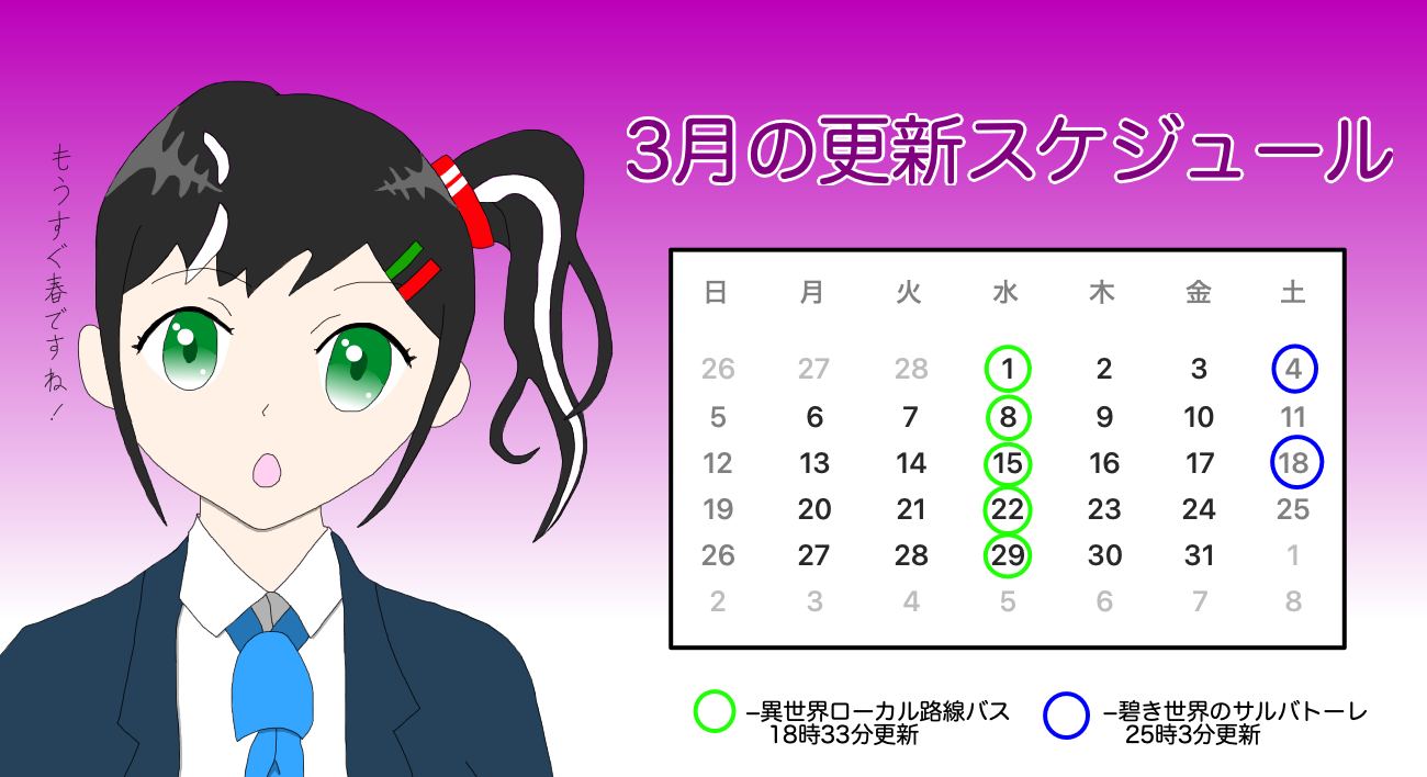 間もなく3月になりますので、3月の更新スケジュールをお知らせします。