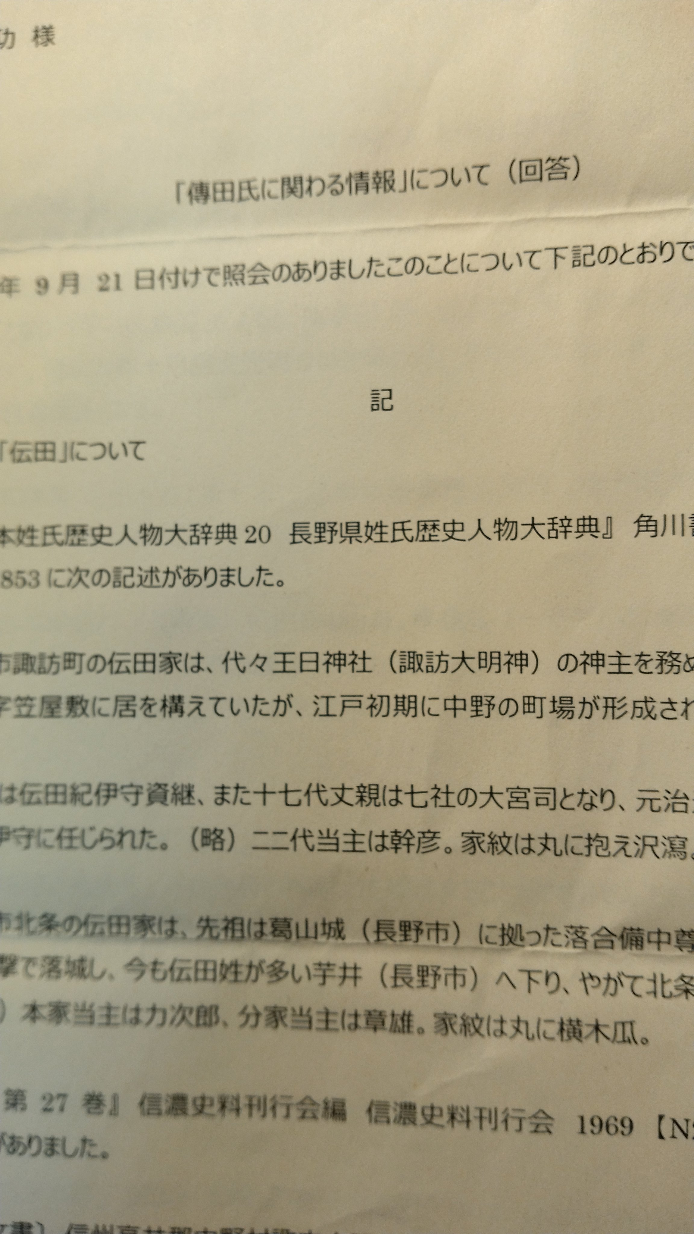・中野市諏訪町の伝田家は、代々王日神社(諏訪大明神)の神主を務めた。(中略)古くは字笠屋敷に居を構えていたが、江戸初期に中野に町場が形成されると移転したとある。(略)10代は伝田紀伊守資継、また17代丈親は七社の大宮司となり、元治元年従五位下に勅許され紀伊守に任じられた。(略)22代当主は幹彦。家紋は丸に抱え沢瀉。