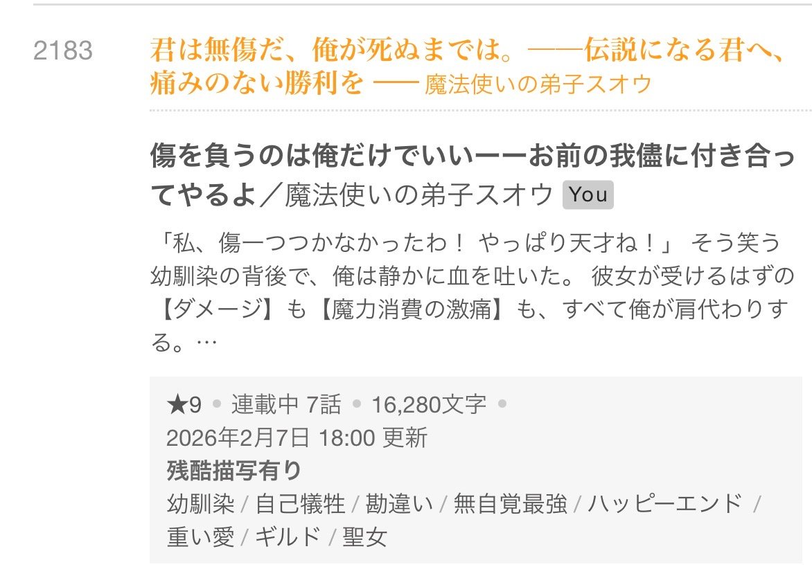 朝起きたら、「傷を負うのは俺だけでいい」が週間ランキング2186位!ランクインです!