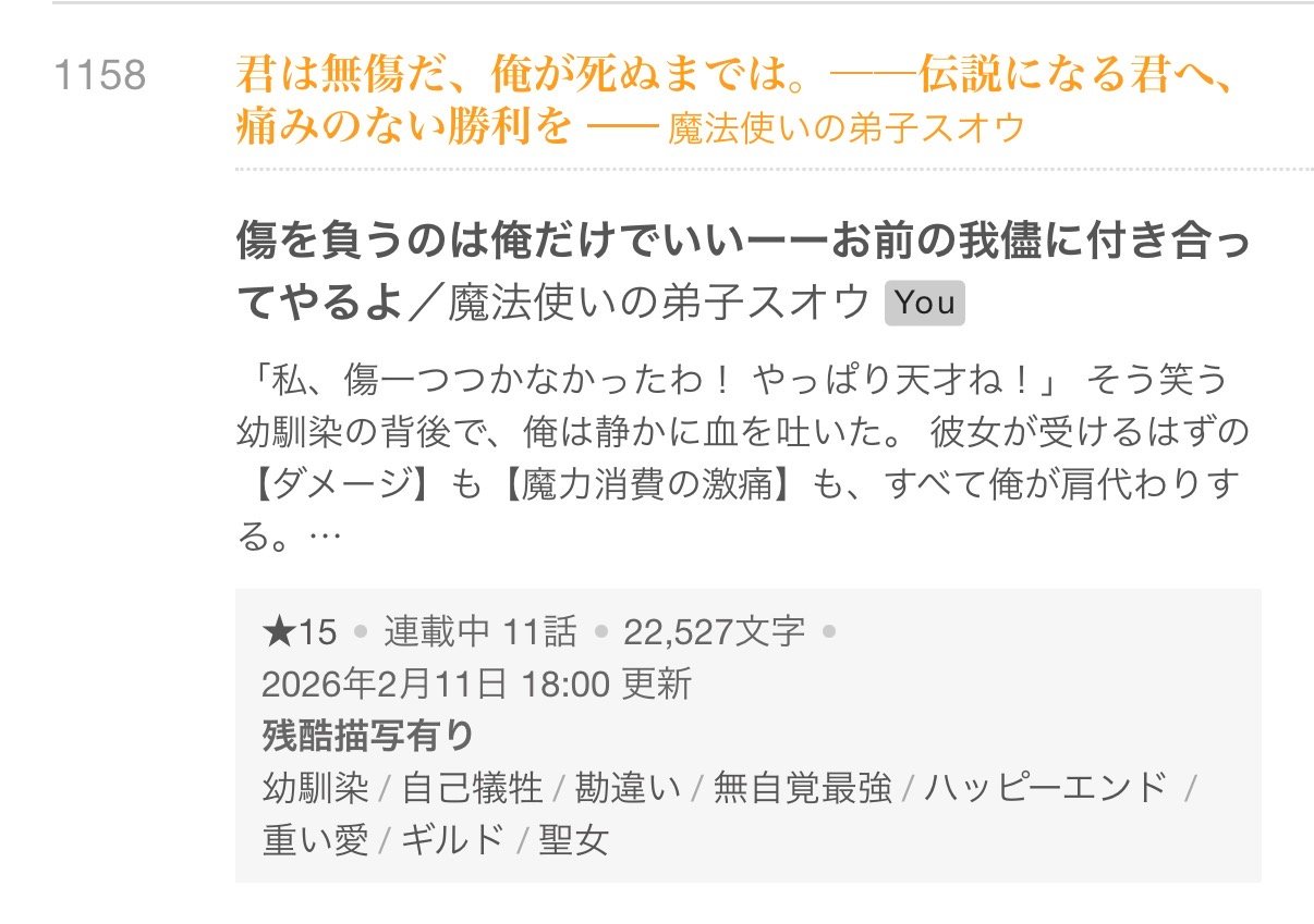 「傷を負うのは俺だけでいい」が異世界ファンタジー、週間ランキング1158位にランクアップ!