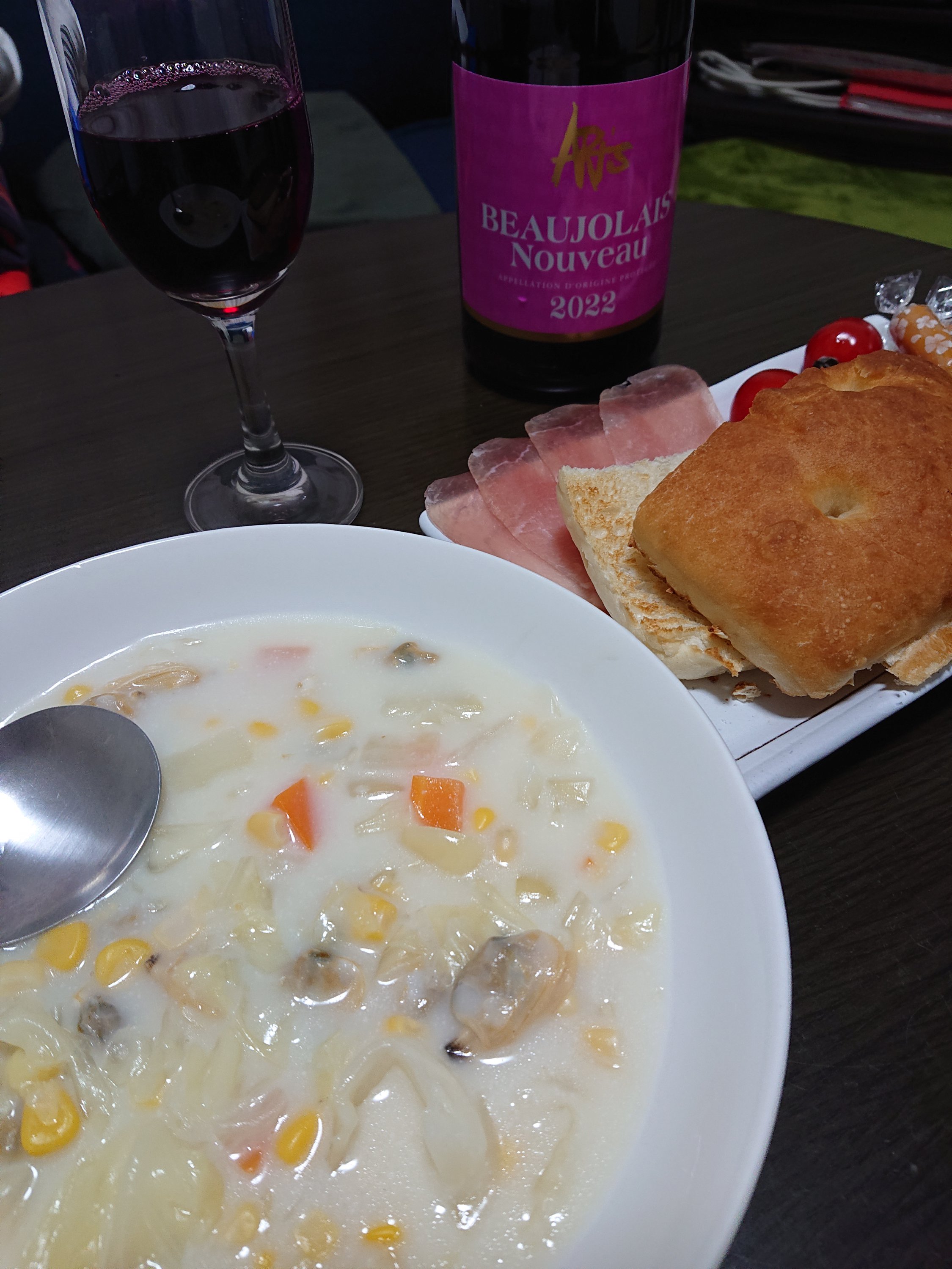 いつものボージョレィ・ヌーヴォーを予想して、ミニトマトとスモークチーズが合うだろうと思いきや、ワインの味がシッカリしていた分、フォカッチャの生ハム乗せが一番合いました。