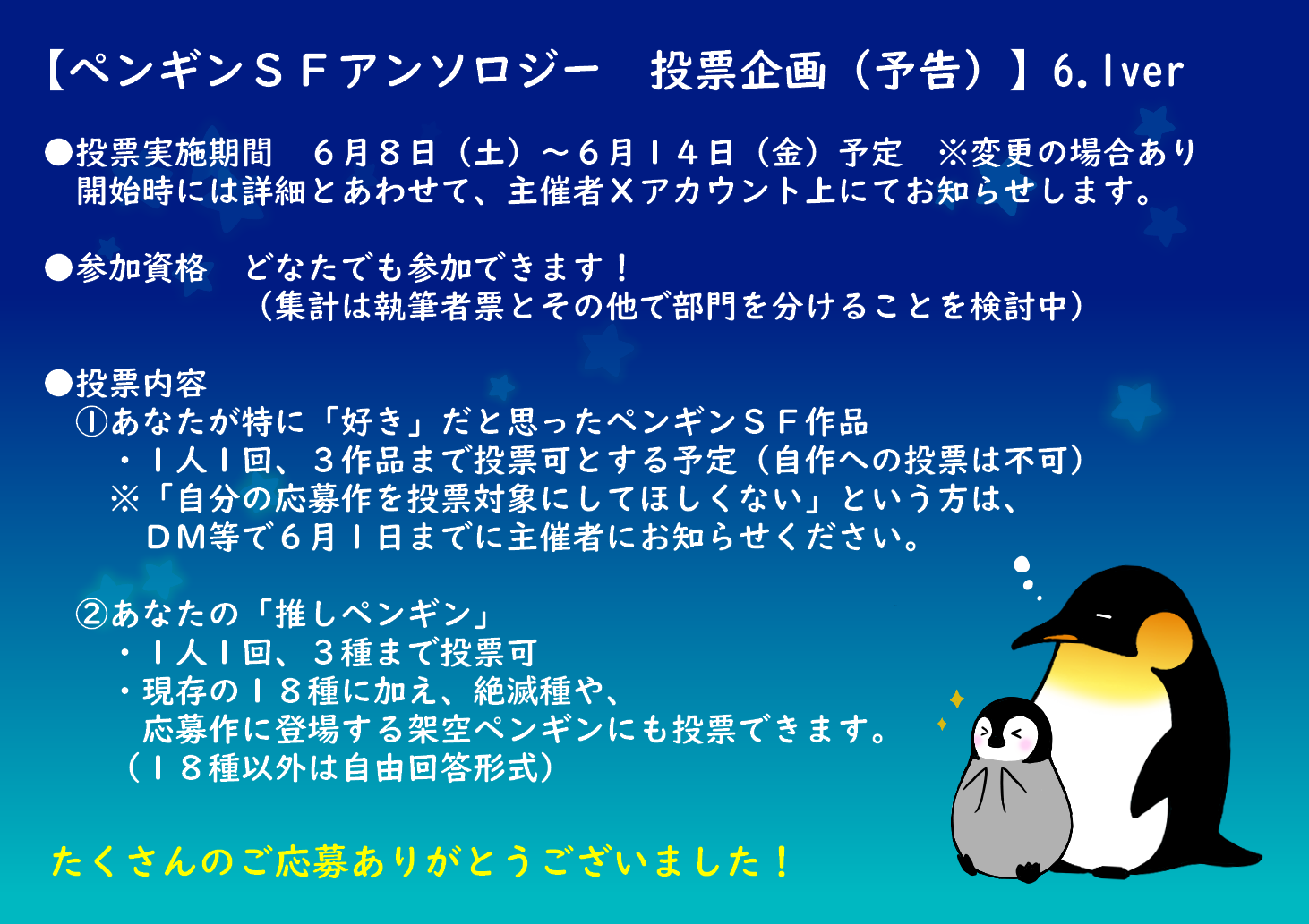 3ヶ月の長きに渡り応募しておりました自主企画「ペンギンSFアンソロジー」、本日0時を持ちまして〆切とさせていただきました。