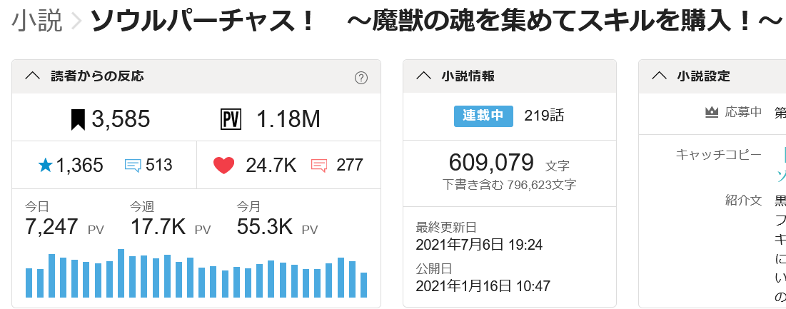 えー、ここで注目してほしいのがソウルパーチャスの下書き含む文字数なんですが……すみません、今日(2021年7月6日)現在で796,623文字あります